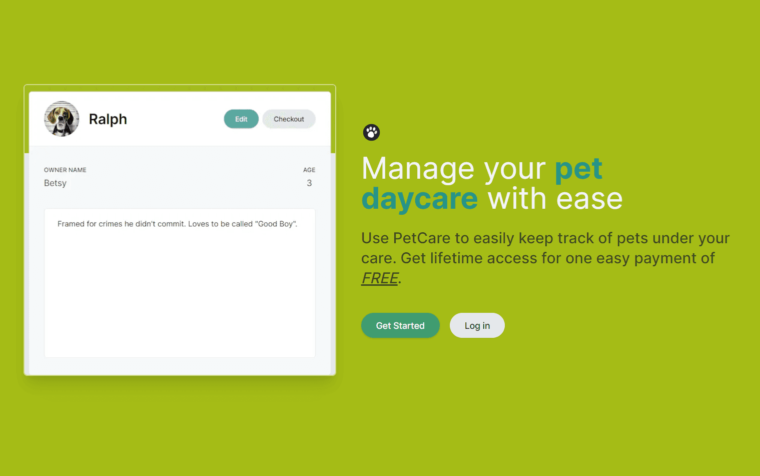 PetCare is a daycare/boarding platform for businesses or individuals to manage and keep track of the pets in their care.